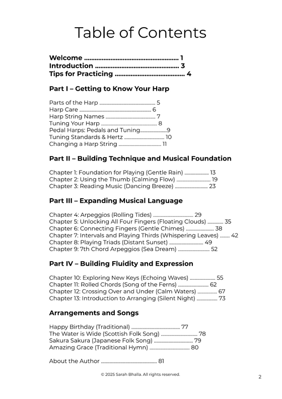 Thirteen chapters to build a solid foundation in technique, learning music, and connecting with the harp, all at your own pace.